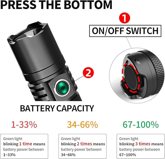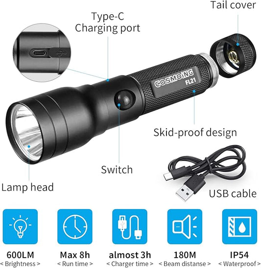 High Power LED Flashlight USB C Rechargeable, 600 Lumen Tactical Flashlight IP65 Waterproof Handheld Flashlight for Emergency,Police Law Enforcement,Hunting,Camping,Hiking