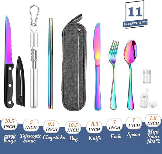 Hommaly Portable Travel Reusable Utensils Silverware with Case,Camping Cutlery set,Chopsticks and Straw Flatware, Stainless steel Utensil set (Rainbow) U