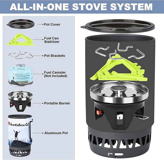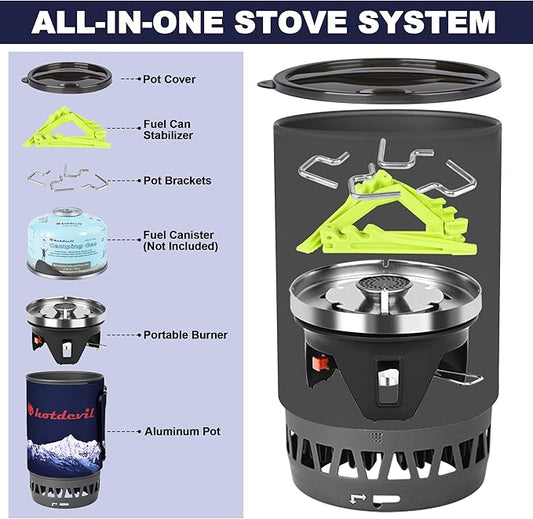 1.4L Backpacking Camping Stove Cooking System with Piezo Ignition, Outdoor Portable Burner with Pot Stabilizer Camp Stove Camping Stove Kit Propane, Ideal for Hiking Fishing Hunting Emergency