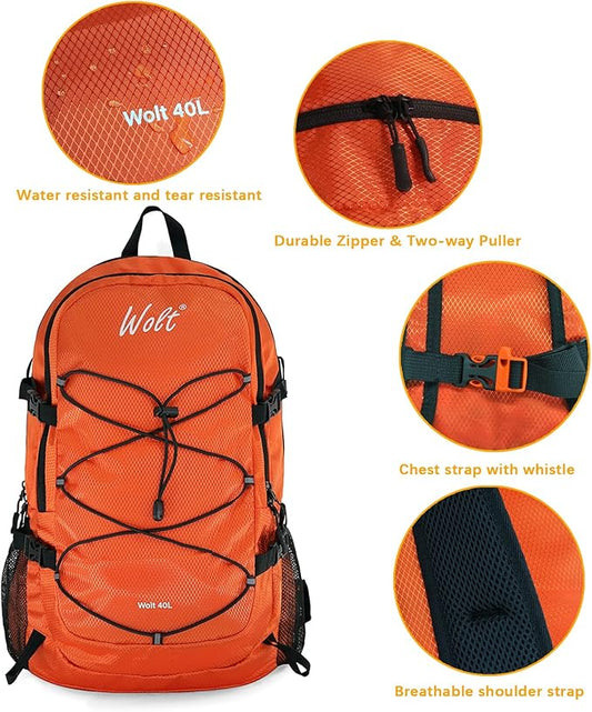 WOLT 40L Packable Travel Backpack, Foldable Lightweight Backpack for Men Women,Waterproof Hiking Bag for Outdoor Camping (Orange)