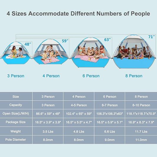 COMMOUDS Beach Tent Sun Shade for 3/4-5/6-7/8-10 Person, UPF 50+ Beach Sun Shelter Canopy Tent, Lightweight, Easy Set Up and Carry