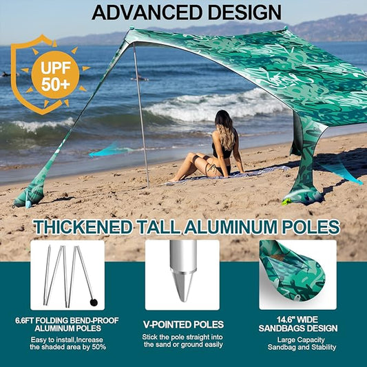 WEKAPO Beach Tent Sun Shelter - Easy Setup Beach Canopy with 4 Sturdy Poles, Large Sandbags and Shovel, 7'1'' Tall, Windproof Sun Shade for Backyard and Camping, UPF 50+ Protection
