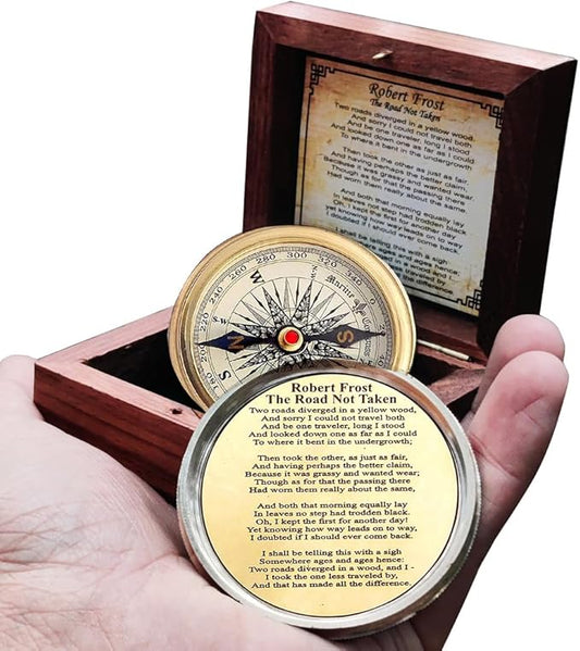 Antiqued Brass Robert Frost Poem Compass with Wooden Box, Inspirational Gifts for Woman, Aniversity Gifts for Men,Engraved Compass,Wedding for Boys, Pocket Compass for Hiking Survival
