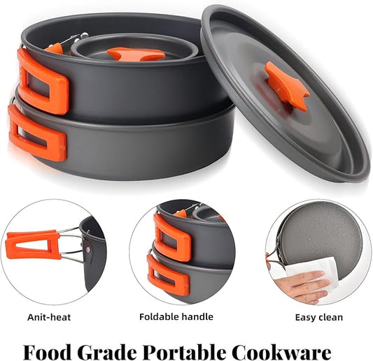 Camping Cookware Set with Silicone Handle, Camping Cooking Set for 2-3 Person,Camp Cooking Set with 1.5L Pot,Camping Pot Pan Set with Kettle and Folding Tableware for Camping Hiking Picnic