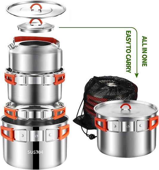 Camping Cookware Set,Camping Cooking Set,304 Stainless Steel Camping Pots and Pans Set,Camping Gear for Hiking Outdoor Cooking Picnics for 2-4 People