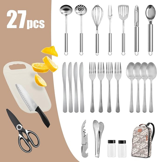 Camping Essentials, Evanda Camping Cooking Utensils, Travel Essentials, Portable Camping Kitchen Utensil Set for Travel, Picnics, RVs, Camping, BBQs, Parties