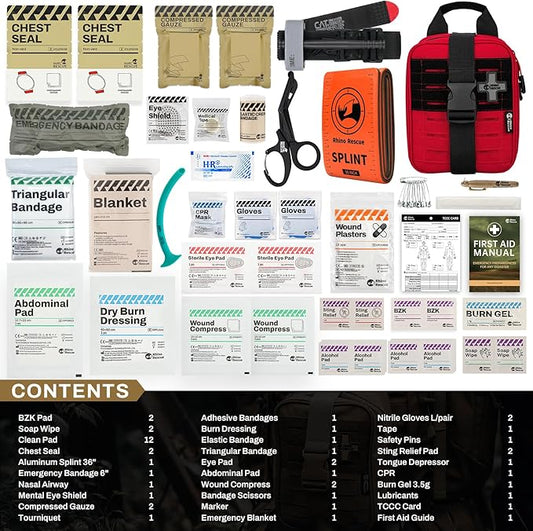 RHINO RESCUE IFAK Trauma Kit with C-A-T Tourniquet, Tactical First Aid Kit Molle Pouch for Military, Combat, Car, Camping, Hiking, Travel, FSA HSA Eligible (Red)