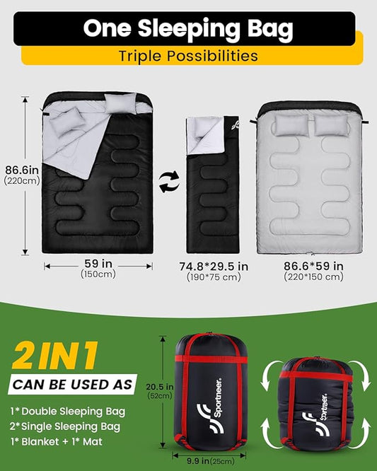 Sportneer Double Sleeping Bag for Adults with 2 Pillows, Queen Size Two Person Sleeping Bag for All Season, 2 Person Sleeping Bags for Cold Weather Camping Hiking Backpacking