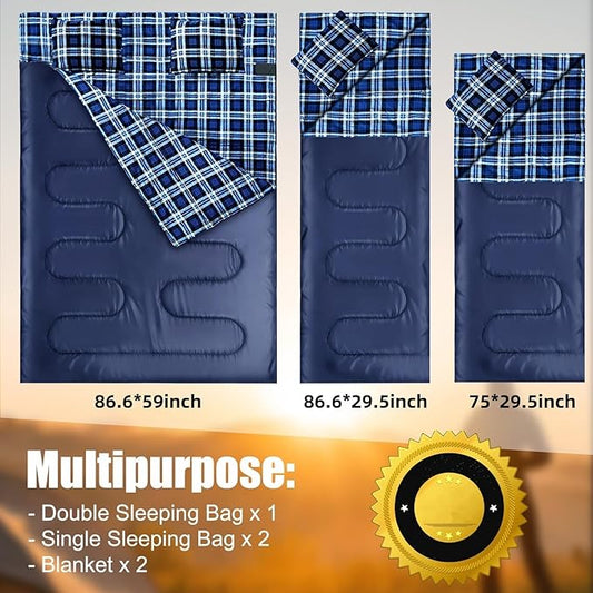 Double Sleeping Bag Flannel for Adults Kids, Queen Size for 2 Person with 2 Pillows, Warm & Cold Weather Sleeping Bag for Camping, Hiking, Waterproof Lightweight with Compression Sack