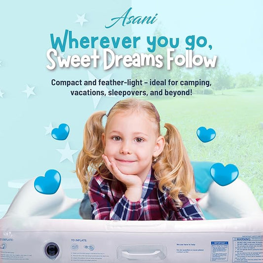 Asani Inflatable Toddler Travel Bed, Electric Pump, Leakproof Air Mattress, Bumpers, Carry Case, Pillow - Fits Kids Up to 4ft - Blue | Portable, Foldable, Ideal for Camping & Sleepovers
