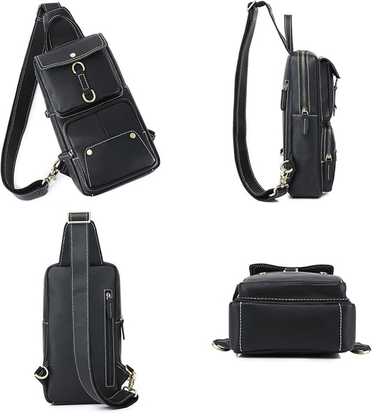 KPYWZER Vintage Leather Sling Bag Bags for Men Women Backpack Shoulder Messenger Crossbody Outdoor Travel Hiking Camping Tactical Chest Pack Daypack Black