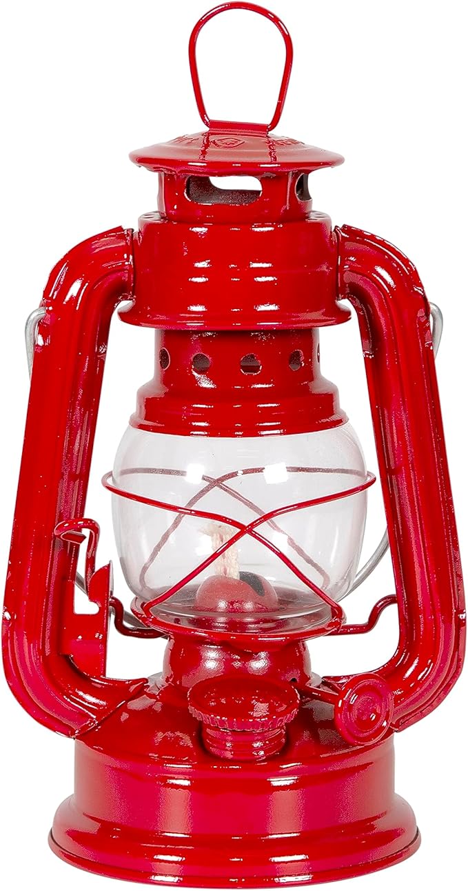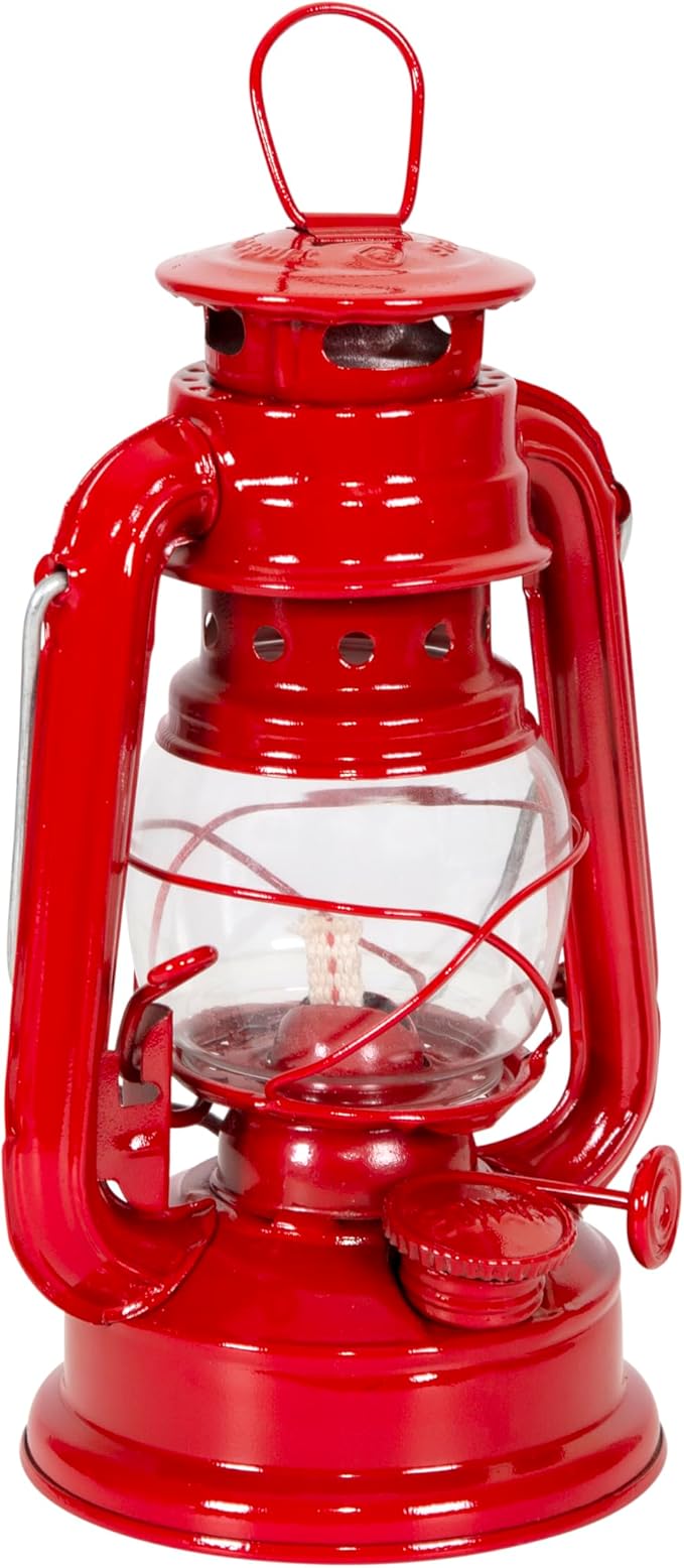 • Classic glass globe lantern with protective wire, metal construction and red finish