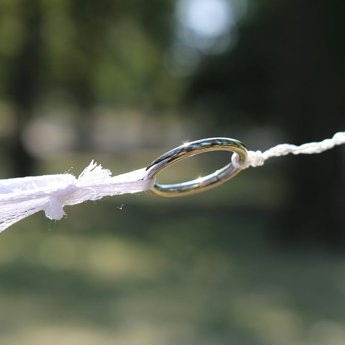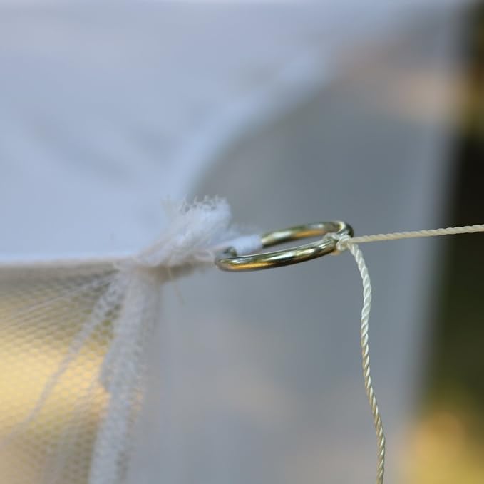 • Six reinforced metal tie tabs at corners and sides; anchor four corners into ground, hang top two corners from tree or posts.