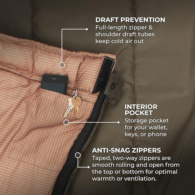 • STAY WARM: Rain or shine, you'll be warm and rested in this sleeping bag. Innovative fiber fill; double-layer construction and draft tubes work together to keep the cold out and the warmth in. Stay cozy on all your outdoor adventures