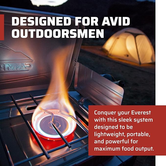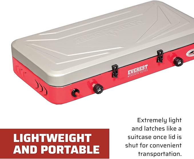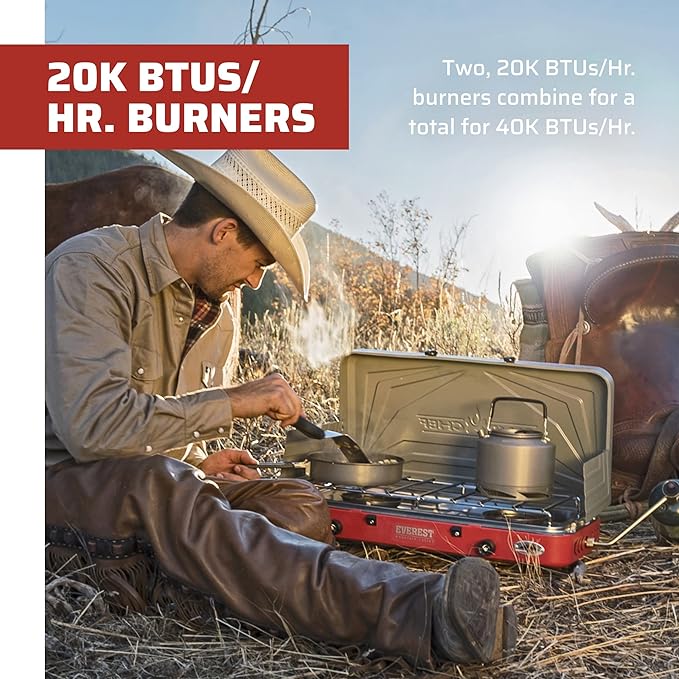 • Powerful Two Burner Stove: Everest's two 20,000 BTU burners are powerful for your cooking needs; lightweight and portable camp stove has a latch lid