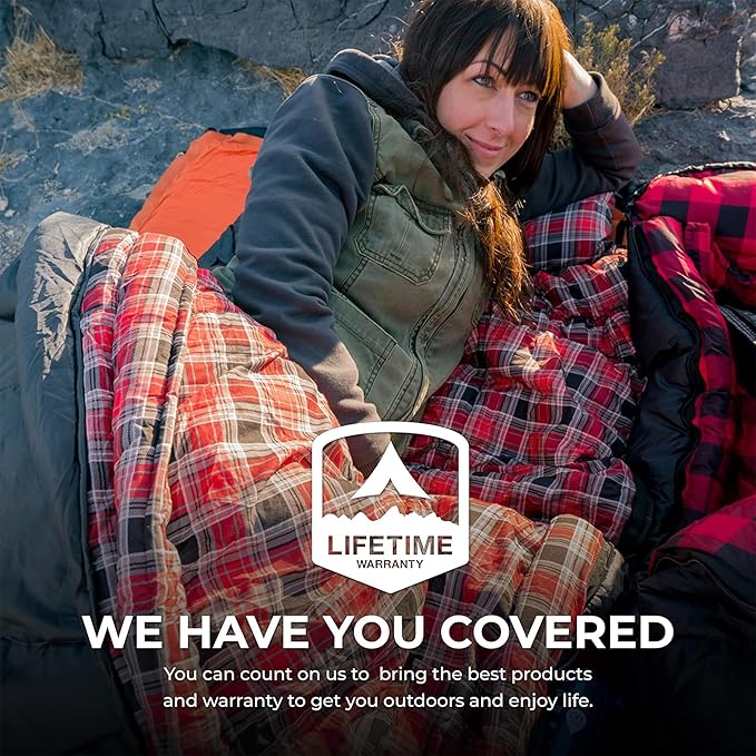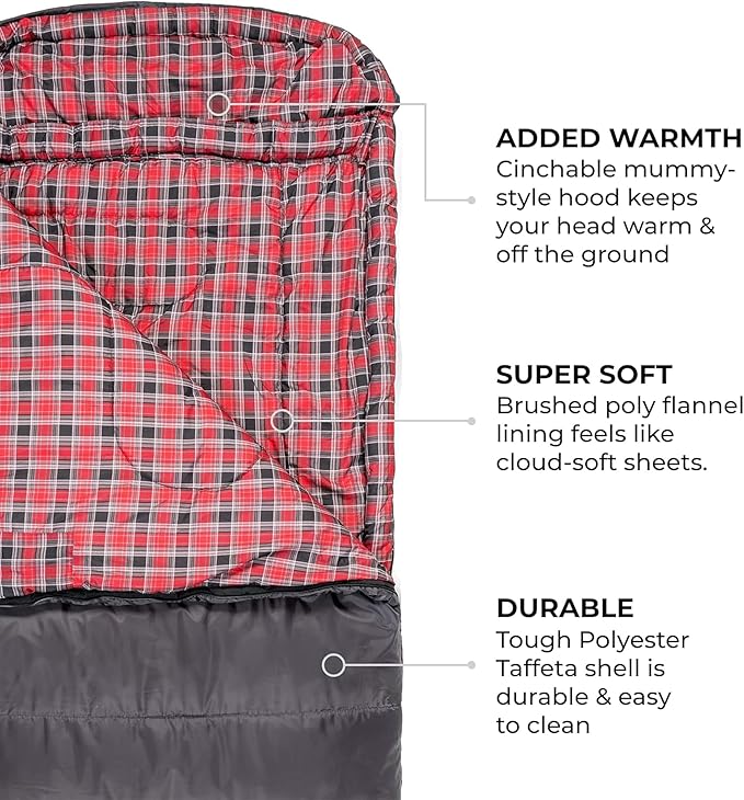 • SLEEP COMFORTABLY: You'll forget you're camping with these comfortable sleeping bags! With a soft poly-flannel lining and plenty of room to spread out. The half-circle mummy-style hood keeps you warm and your pillow clean, unzips on each side