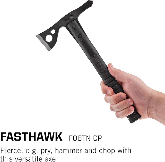• HAMMER AXE EDGE AND PIERCING SPIKE: FastHawk tactical survival axe features a flat edge for hammering and a spike for piercing; a throwing axe first, but versatile to handle small wood chopping tasks