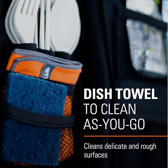 • Clean dishes after eating with scrubber and microfiber dish cloth; Store all 24 pieces in the compact nylon ballistic case—portable and keeps everything organized.