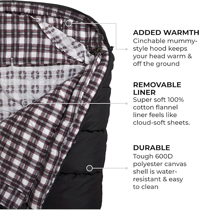 • TOUGH, DURABLE SLEEPING BAG: Soft cotton flannel liner and rugged, water-resistant canvas shell will stand up to years of rigorous adventures