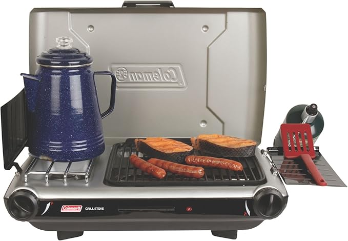 Coleman Tabletop 2-in-1 Grill & Stove with 2 Adjustable Burners, Propane Grill/Stove with Push-Button Starter, Wind Guards, Grease Tray, & 20,000 BTUs of Power for Camping, Tailgating, & More