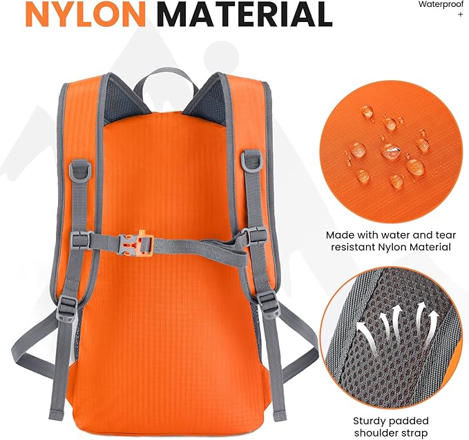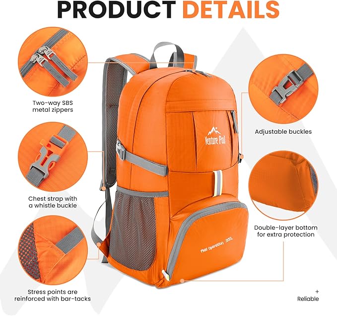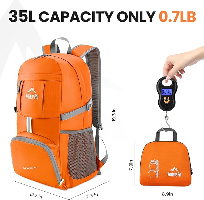 • LIGHTWEIGHT(0.7LB) and ROOMY(35Liters). Fold the backpack into its own pocket and unfold it when you reach your destination. To avoid overweight charge, simply unfold from your checked bags and use it as a carry on for your excess baggage.