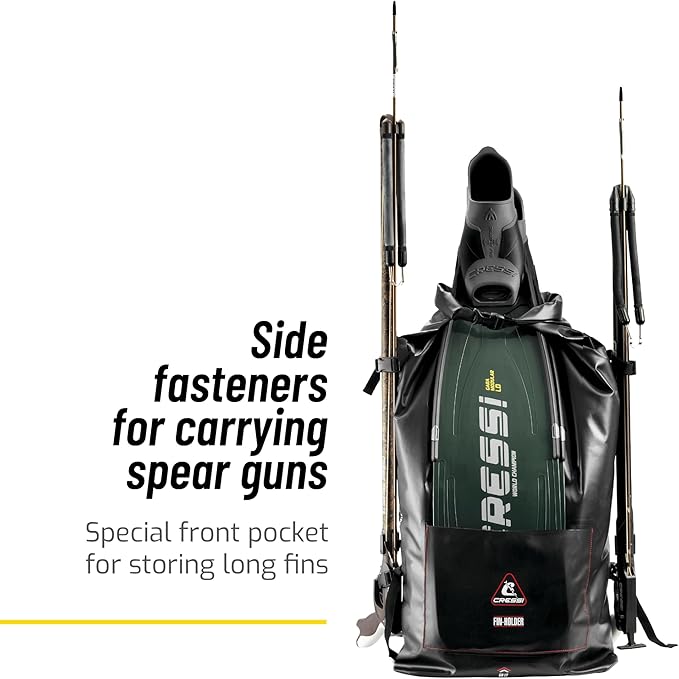 • Special front pocket for storing long fins as free diving fins like the Cressi Gara; Side fasteners for carrying spear guns
