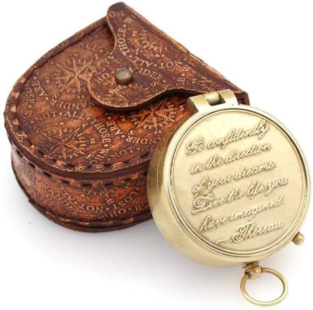 • Personalized Gift Compass: Brass Engraved Compass with Stamped Leather case. Brass Compass "GO CONFIDENTLY IN THE DIRECTION OF YOUR DREAMS LIVE THE LIFE YOU HAVE IMAGINED". Under the glass cover is beautiful, the high-quality jewelled compass needle settles to the North very quickly for timely and accurate readings. It has a small lever on the side of the compass that operates a needle lift mechanism to protect the compass bearing. Gift for someone you love. Engraved message of the Compass.