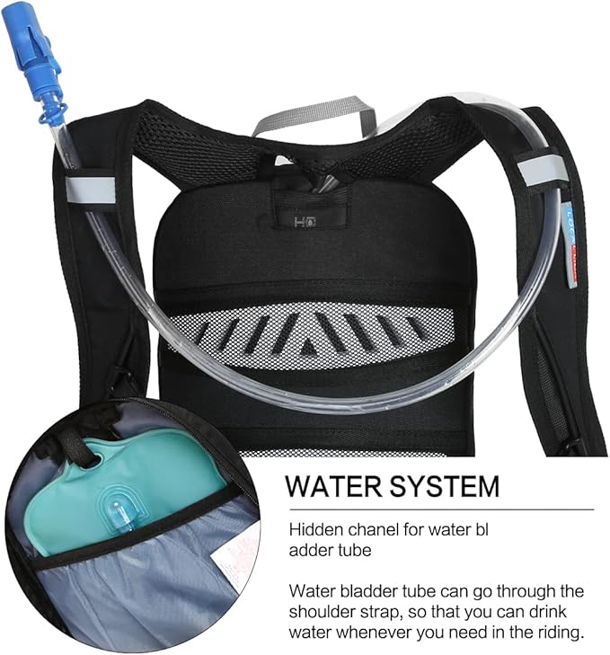 • EASY DRINKING SYSTEM: This cycling backpack adopts a system to drink water easily. On the shoulder straps of this cycling backpack, there is an opening to exit the hose, you can drink water easily during cycling. There are also mesh side pockets to put your water bottle. (NOTE: WATER BLADDER IS NOT INCLUDED)