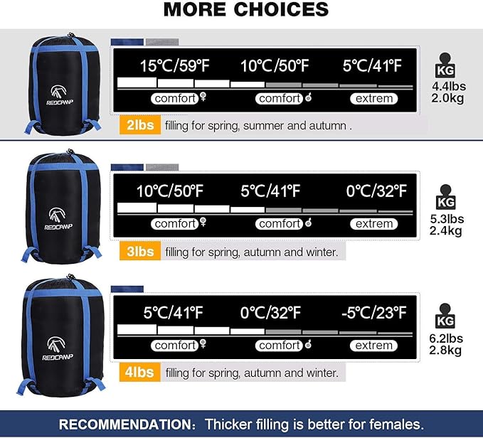• Temperature Range: 2lbs filling flannel sleeping bags for adults are comfort in 50°F/10 °C and fits temperature range 41 - 59 °F/ 5- 15 °C. 3lbs filling sleeping bags is comfort in 41°F/5°C and fits temperature range 32-50 °F/0-10 °C. Females are recommended to choose the thicker sleeping bags.