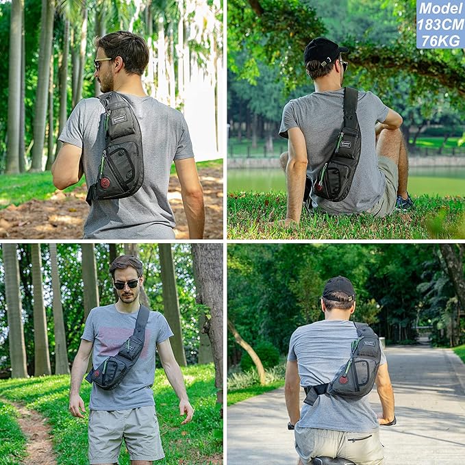 • Material: This sling bag is well constructed of water-resistant nylon material. Lightweight, strong and sturdy. Not easy to be scratched. The size of it is bigger than a fanny pack, but not as big as a backpack.