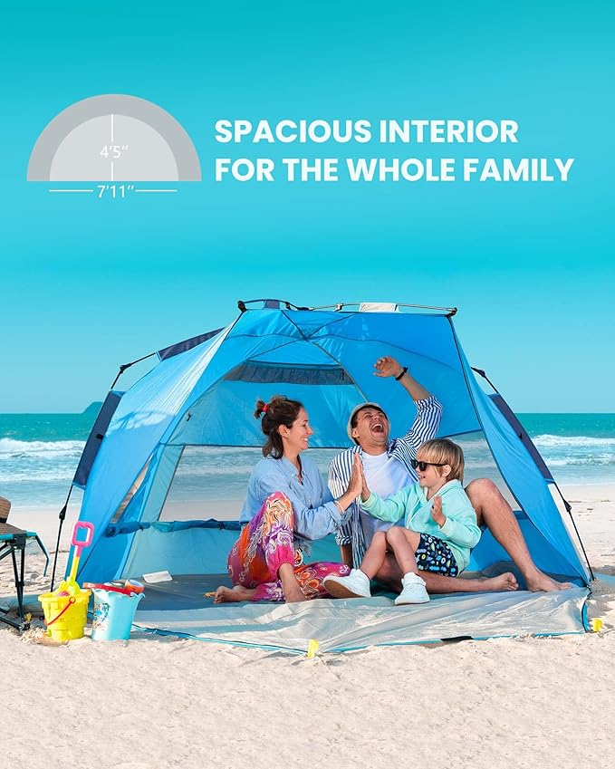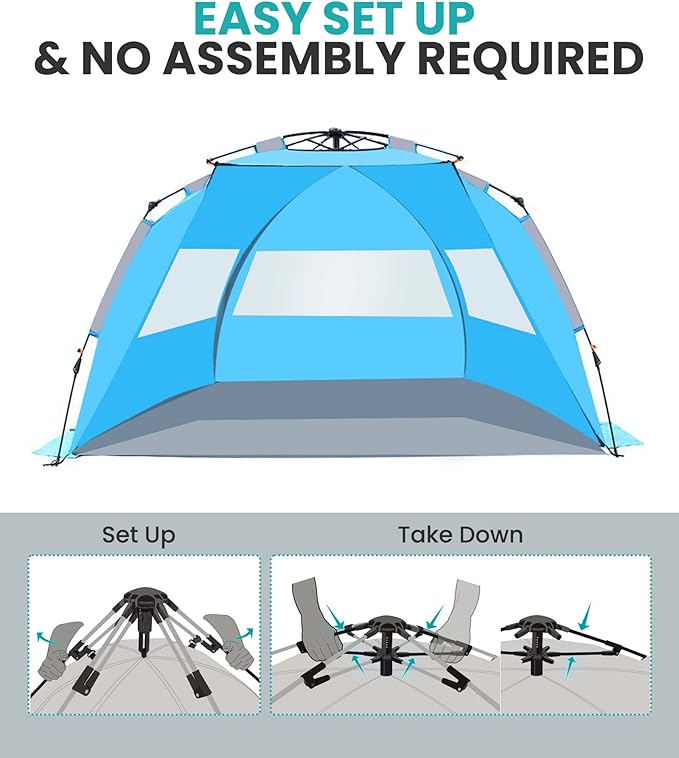 • Easy Set Up and Portable: This pop up beach tent allows to set up in seconds, without complicated installation steps. Frustrated days of putting up and taking down large beach tents has gone! Lightweight and easy to fold back with a compact carrying bag for easy transport and storage