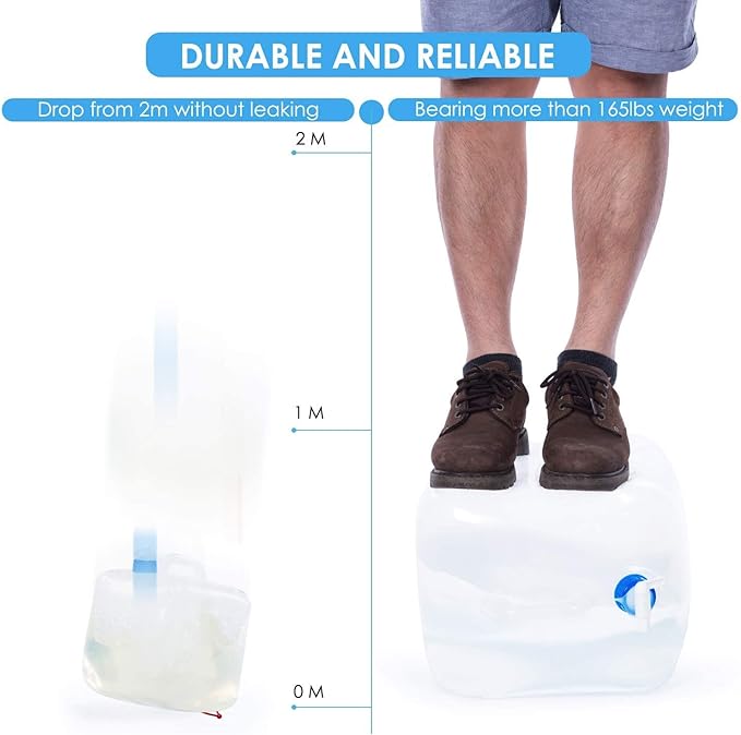 • ✔Emergency Preparedness: The collapsible water containers are designed for emergency situations. A 2.6 gallon container provides enough water for 1 person and 2 pets (dogs or cats) for one day, while a 5.3 gallon container provides enough water for 3 people for one day. In case of a natural disaster, such as a hurricane, tornado, drought, earthquake, flood, mountain fires, snowstorm, biohazard, or even world war, this water container can serve as an essential life-saving tool in a survival kit.