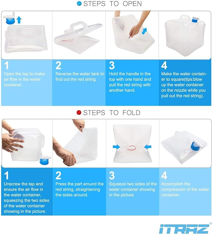 • ✔30-DAY SATISFACTION GUARANTEE: If our collapsible water container is defective or you are not satisfied for any reason within 30 days, we are willing to offer a full refund or replacement! THANK-YOU BONUS: ITRAZ wants you and your family to be prepared and includes a 39-page eBook "How to Prepare for Camping & Emergency" survival guide.
