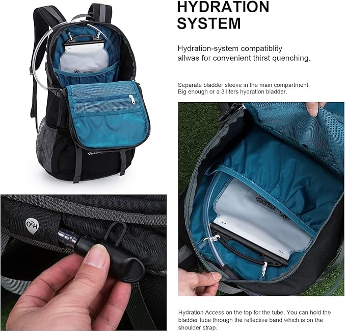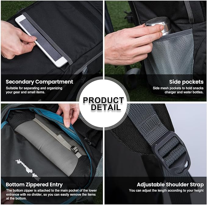 • Well-designed details: This outdoor backpack has many clever and convenient designs. The bottom compartment provides direct access to the main compartment; there is also a dedicated compartment for a water bladder (WATER BLADDER NOT INCLUDED), In addition, various shrink straps can also carry camping equipment such as trekking poles, sleeping bags and tents.