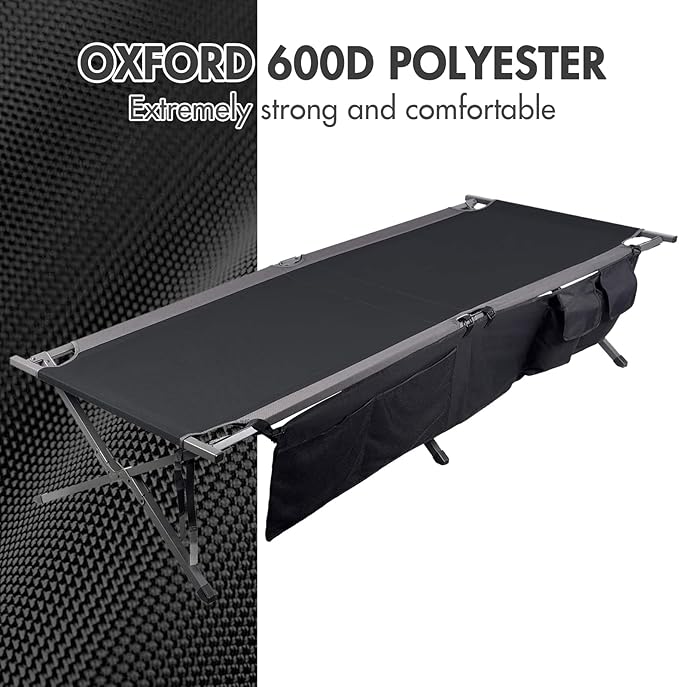 • STURDY CONSTRUCTION: Built for the outdoors, this camping bed is constructed with a powder-coated steel frame that resists rust, corrosion, and abrasion, and an oxford 600D polyester canvas. It's made to withstand the elements, making it a reliable choice for your outdoor adventures.