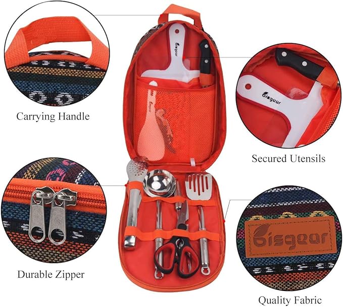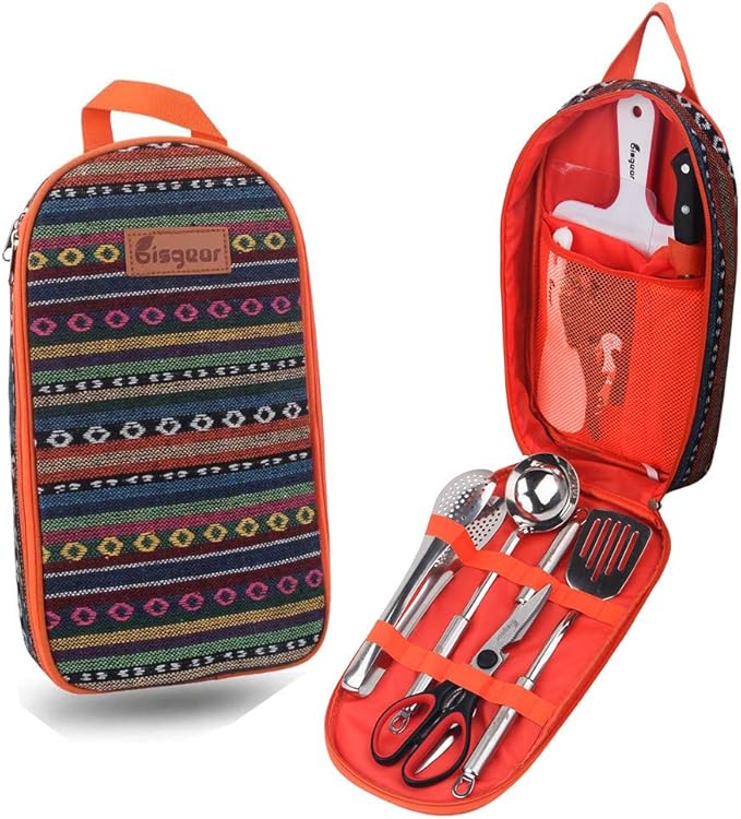 • MULTIPURPOSE: The trendy kit can be used for multiple applications, perfect for camping, sporting events, hiking, boat rides, mountaineering, BBQs, and more. The weather retardant travel utensil kit is the perfect camp kitchen accessory, and it holds all your essential outdoor cooking utensils.