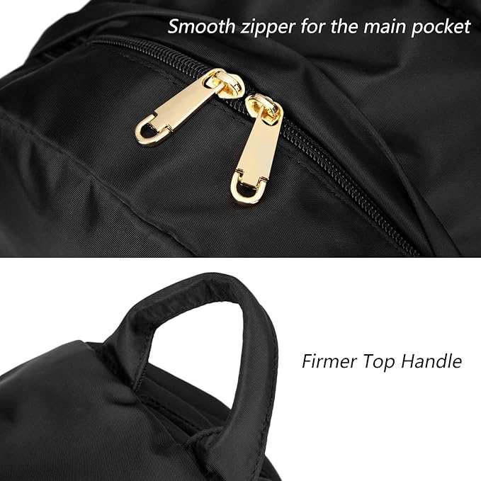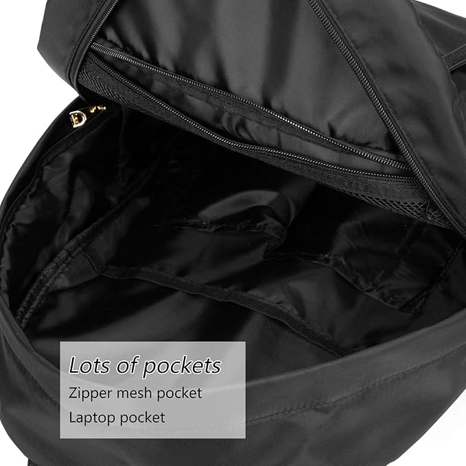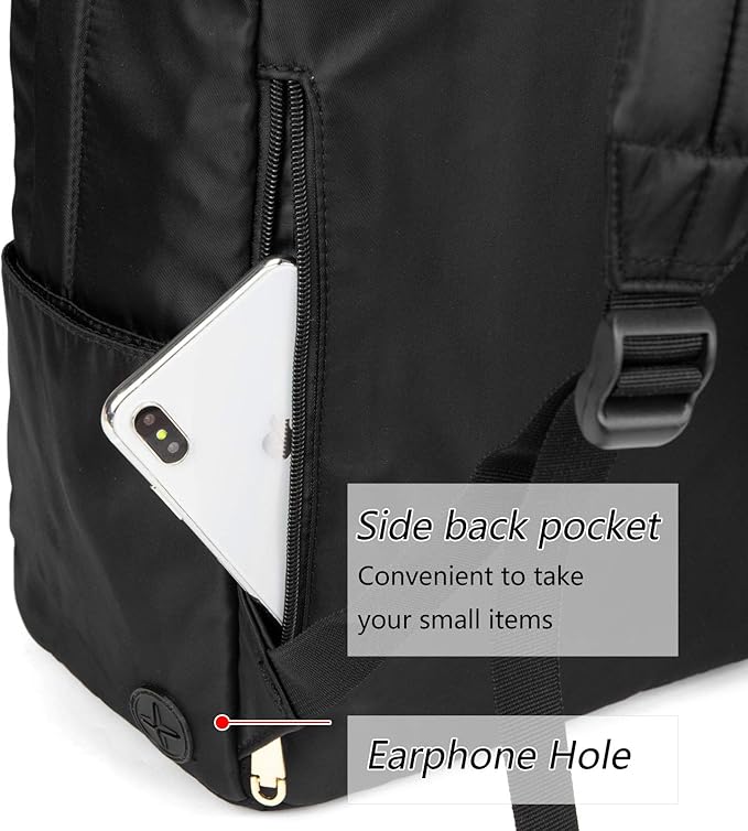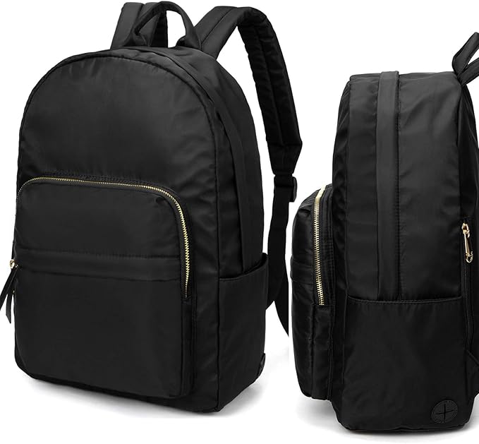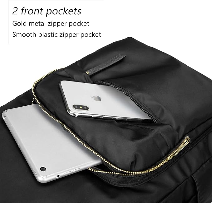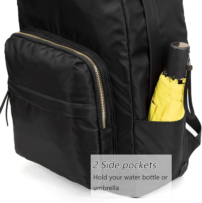• Side pockets for water bottle. Spacious main pocket, gold zipper front pocket, enough space to carry on your school supplies, clothes, umbrella, notebooks, A4 folder, and most 14"laptop ( some ultra-slim 15.6 inch MacBook)
