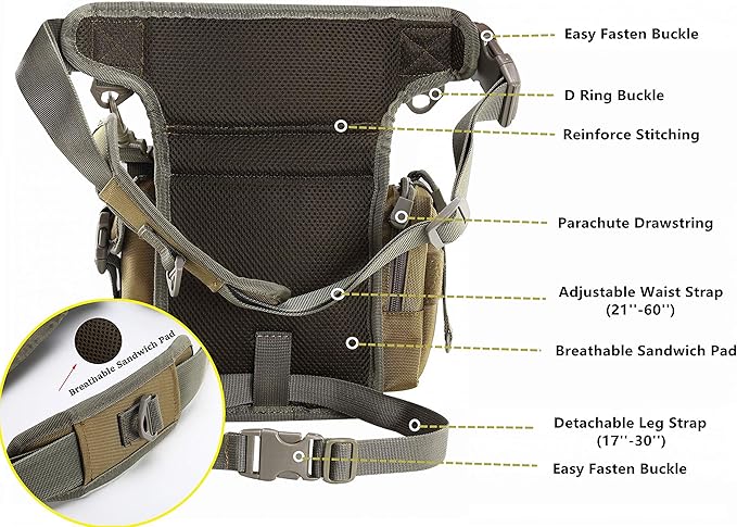 • ✅ EASY USE: Waist strap with 21’’-60” and detachable leg strap with 17’’-30” make it suit for different size people, and the buckles on the straps make this double leg drop bag easy to fasten and take off.
