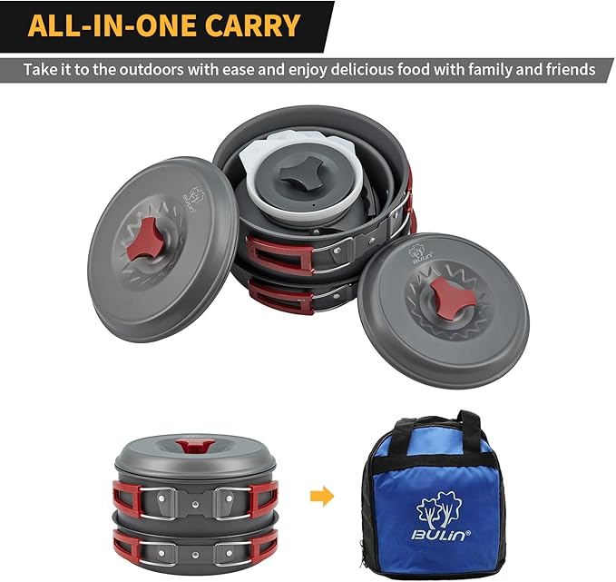 • Complete 3-4 Cookware Sets:Our backpacking cooking set includes 2 pots with lids,1 frying pan, 1 kettle,4 BPA -free bowls,2 BPA Free plates,1 BPA Free foldable soup spoon, 1 rice ladle, and 1 cleaning sponge. Ideal for 2-4 person.You can enjoy delicious food with your lover anywhere.Best money ever spent.