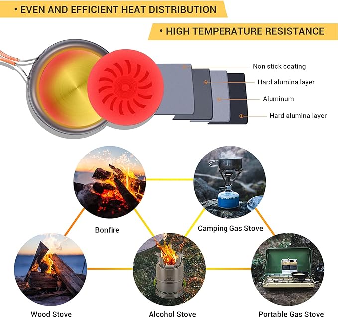 • Multi-Ways for Cooking:The cookware set can be hung over the open fire. Perfect for camping, hiking, backpacking, picnic, etc. Since we do not use chemical layers, the ability of non-stick is limited. For some easily sticky ingredients, please try not to cook directly without oil.