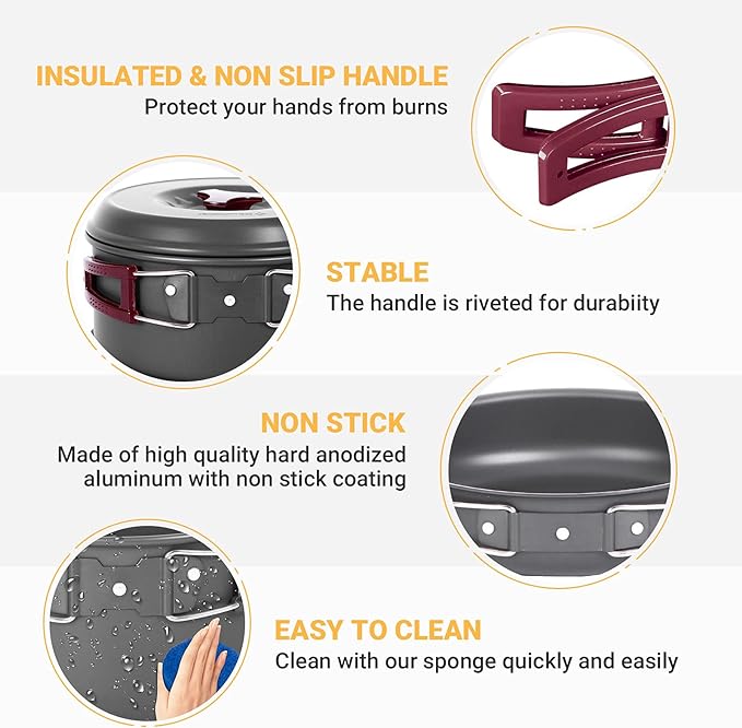 • Food-grade Material:The camping mess kit is made of safe, non-toxic aluminum with non-stick coating for easy cleaning. Hard-anodized aluminum conducts heat quickly,stand high temperature, corrosion-resistant, rust-free,built to last. Heat-resistant handles to keep your fingers safe from the heat.Secure and anti-scald.