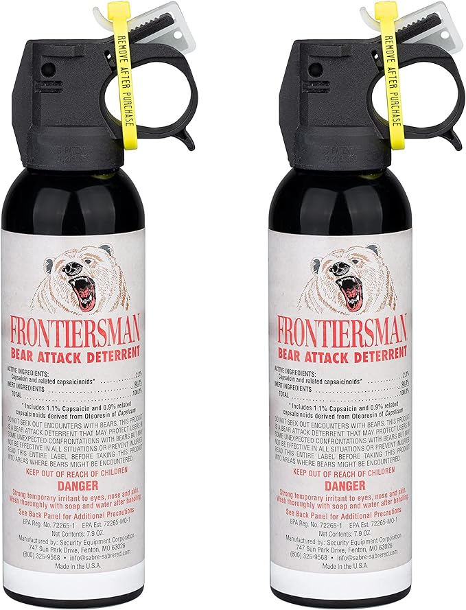 SABRE Frontiersman 7.9 fl oz. Bear Spray, Maximum Strength 2.0% Major Capsaicinoids, Powerful 30 ft. Range Bear Deterrent, Outdoor Camping & Hiking Protection, Quick Draw Holster & Multipack Options
