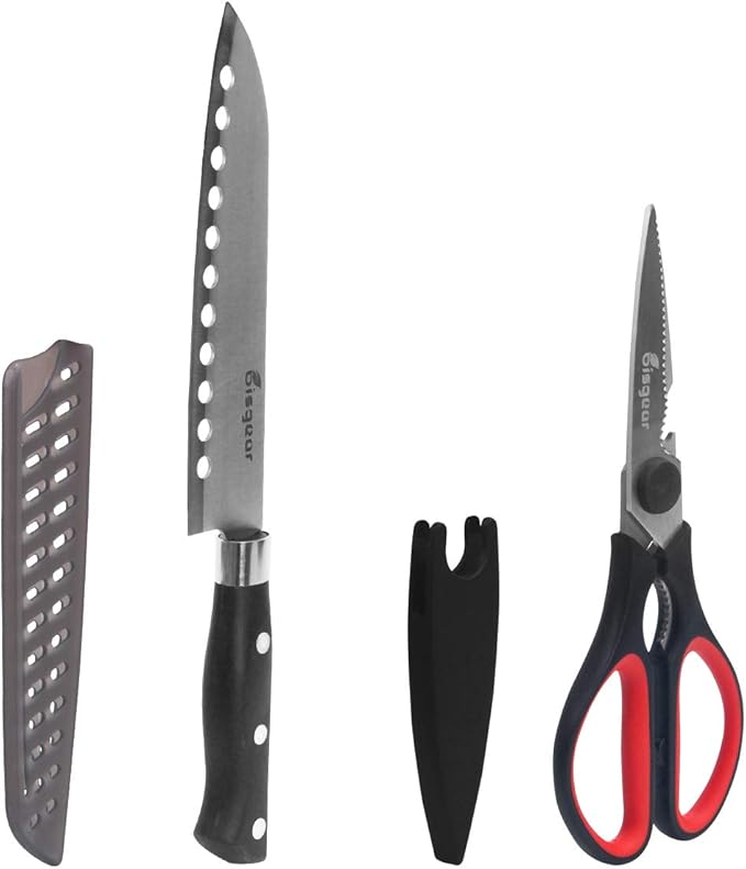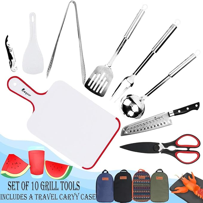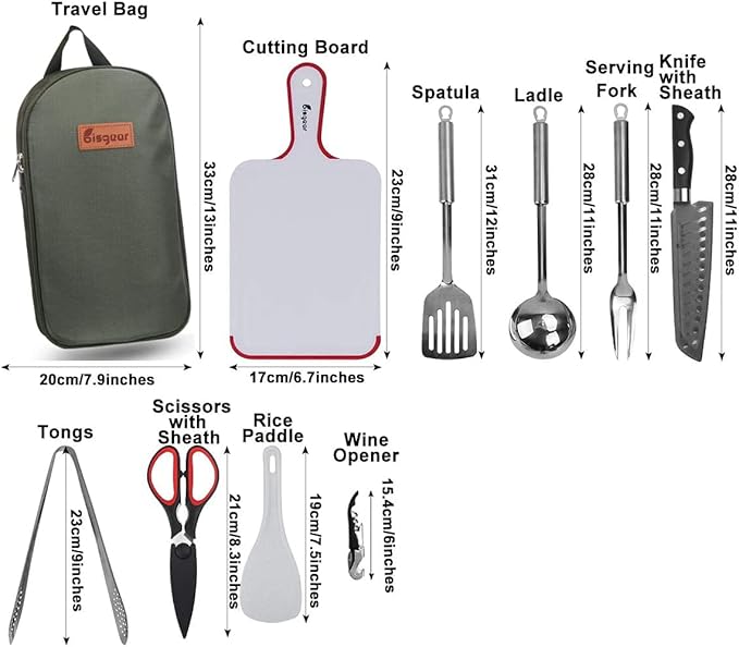 • UPGRADED COMPACT ORGANIZER: Neatly organizes and holds your utensils in one convenient place. Each utensil has its own designated pouch, so units don’t get smeared, scratched or damaged in storage or in transit. This 10PCs set includes: Serving Fork,Scissors with Sheath, Utility Knife with Sheath, Cutting Board, Spatula, Wine Opener, Tongs, Ladle, Rice Paddle