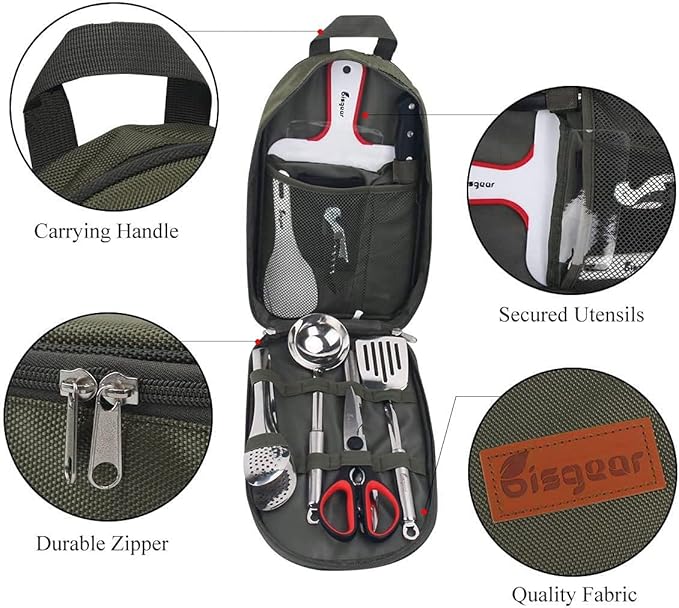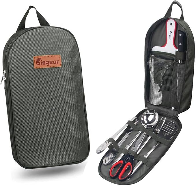 • MULTIPURPOSE: The trendy kit can be used for multiple applications, perfect for camping, sporting events, hiking, boat rides, mountaineering, BBQs, and more. The weather retardant travel utensil kit is the perfect camp kitchen accessory, and it holds all your essential outdoor cooking utensils.