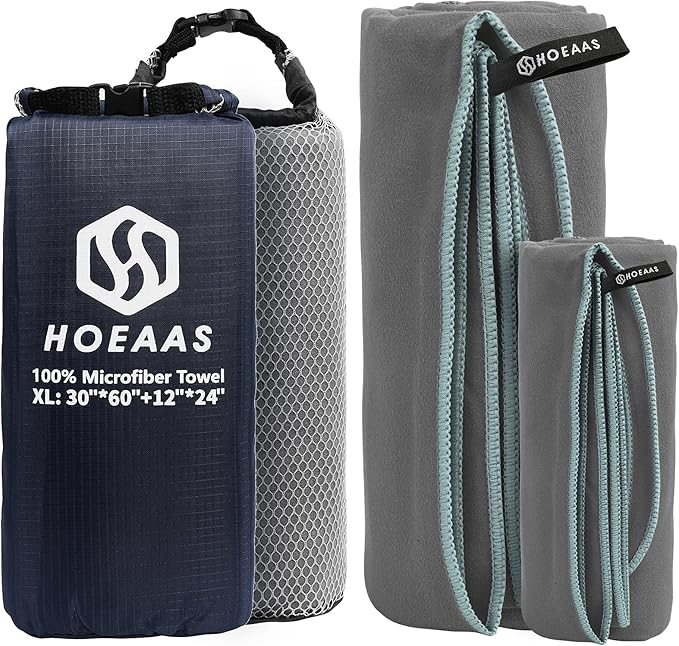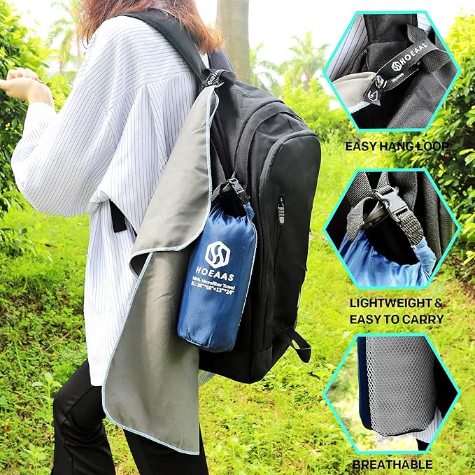 • SUPER ABSORBENT & QUICK DRYING: HOEAAS microfiber camping towel is made of soft and skin-friendly microfiber fabrics, which super absorbent and fast drying. Soaks up 5X its weight in water and dries nearly 10X faster than cotton towel, repeat use it a short time, no bad odors. So you never have to worry about your microfiber beach towels soiling or stinking up the rest of your gear. After dry your sweat or body water, Spread out or hang up the quick dry towel will be dry in minutes!