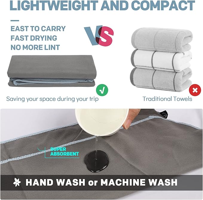 • MULTI-FUCNTIONAL QUICK DRY TOWEL & GIFT IDEA: Lightweight and compact microfiber towel for travel is super versatile for any situation. Such as backpacking, travel, camping, hiking, swimming, yoga, golf, gym, fitness, exercise. Perfect for covers your sun lounger, deck chair or camping undera beach umbrella&sun shelter. The travel towel also looks really fashionable and sporty, which makes it a great gift idea for your family and friends. Of course, if you have any problem, please contact us.