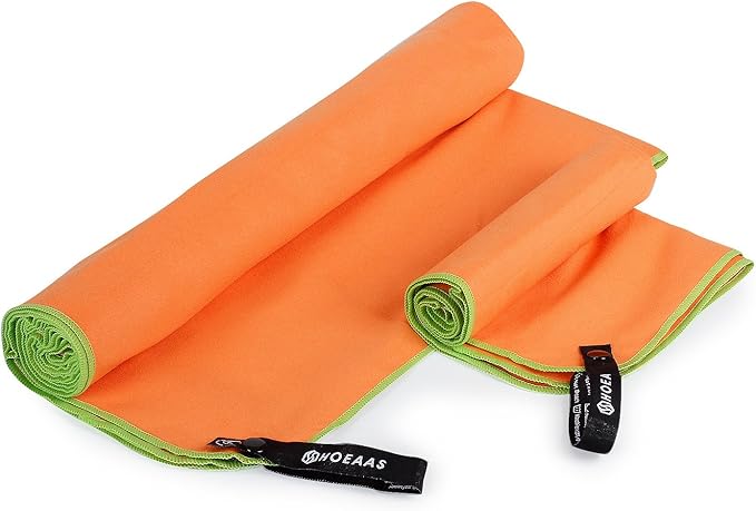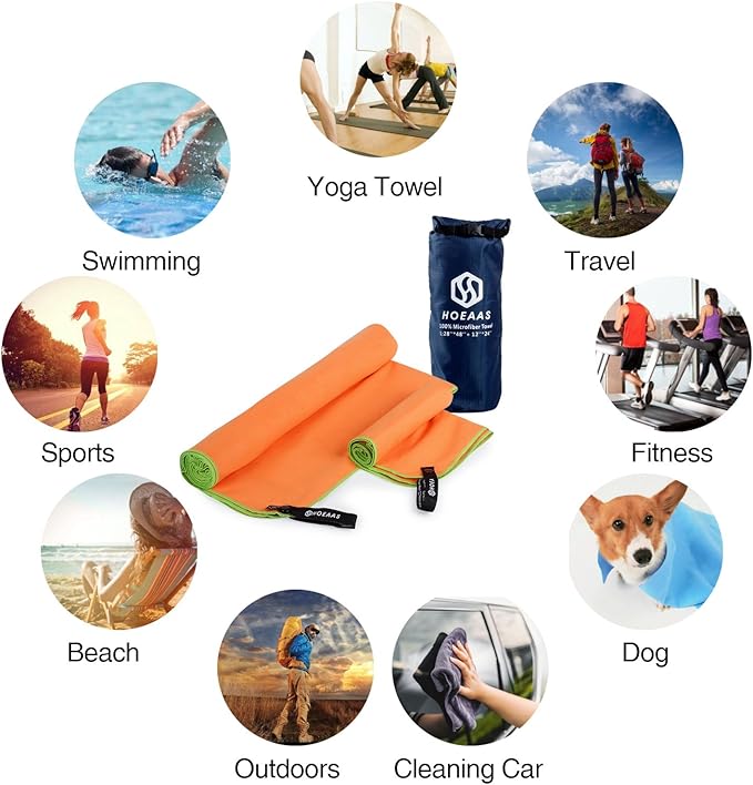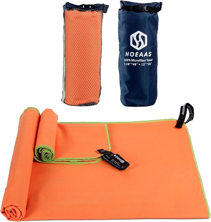 • SUPER ABSORBENT & QUICK DRYING: HOEAAS microfiber camping towel is made of soft and skin-friendly microfiber fabrics, which super absorbent and fast drying. Soaks up 5X its weight in water and dries nearly 10X faster than cotton towel, repeat use it a short time, no bad odors. So you never have to worry about your microfiber beach towels soiling or stinking up the rest of your gear. After dry your sweat or body water, Spread out or hang up the quick dry towel will be dry in minutes!