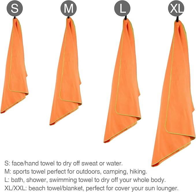 • GREAT OPTIONS & EASY HANG LOOP: Each HOEAAS microfiber towels with a hanging snap loop so it is convenient hanging for quick dry anywhere without blew away. S (2pcs 32 x 16 inch) used as face towel or workout towel. M (40 x 20inch+24 x 12inch) is perfect for sport towel to around your neck. L (48 x 28inch+24 x 12inch), used as bath towel or gym towels. XL(60 x 30inch+24 x 12inch) and XXL towel (72 x 32inch+24 x 12inch) is an ideal choice for yoga mat or beach blanket, perfect for pool and beach.