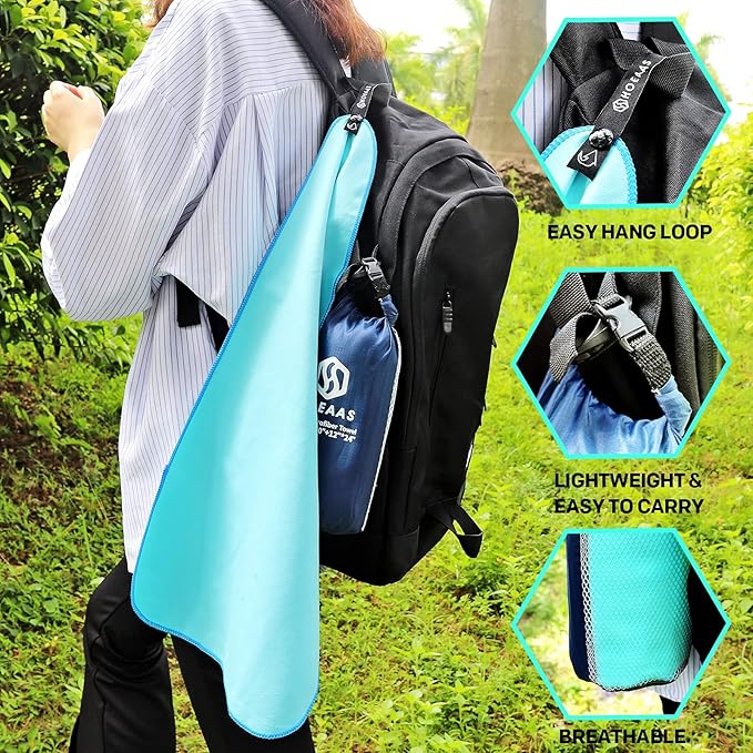 • SUPER ABSORBENT & QUICK DRYING: Microfiber camping towel is made of soft and skin-friendly microfiber fabrics, which super absorbent and fast drying. Soaks up 5X its weight in water and dries nearly 10X faster than cotton towel, repeat use it a short time, no bad odors. What's more surprising is that you never have to worry about your microfiber beach towels soiling or stinking up the rest of your gear. After dry your sweat or body water, Spread out or hang up the quick dry towel will be dry.