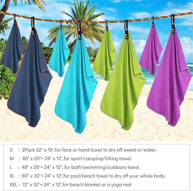 • GREAT OPTIONS & EASY HANG LOOP: Each microfiber towels with a hanging snap loop so it is convenient hanging for quick dry anywhere without blew away. S (2pcs 32 x 16 inch),used as face towel or workout towel to dry off sweat or water. M (40 x 20inch+24 x 12inch) is perfect for sport towel to around your neck. L (48 x 28inch+24 x 12inch), used as bath towel or gym towels. XL(60 x 30inch+24 x 12inch) and XXL towel (72 x 32inch+24 x 12inch) is an ideal choice for a yoga mat or a beach blanket.